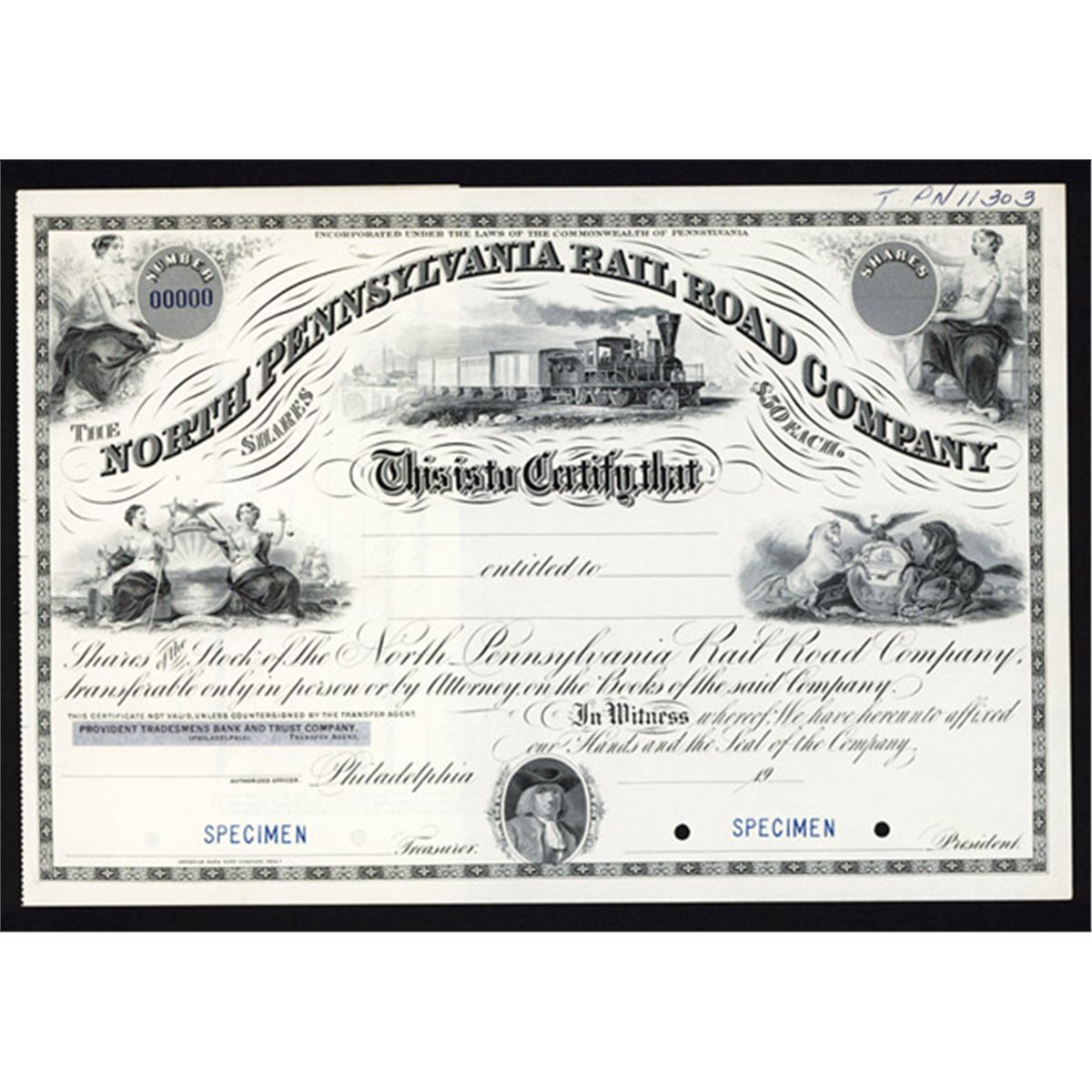 Philadelphia, Pennsylvania, 19xx (ca.1900-1920), Odd Shares, Specimen, Train, Women in upper corners, New York and Pennsylvania arms, William Penn below, POC's, XF. ABNC.