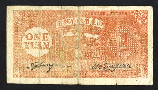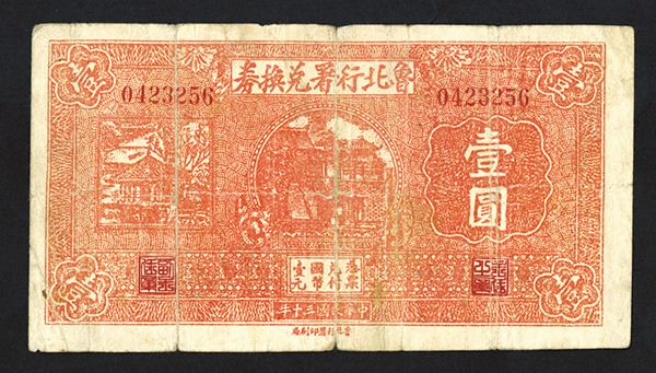 China, local banknote issued by the North Shandong (Lubei) Province Administrative Office in 1941, with a serial number of 0423256. The front shows oriental gardens and buildings, with texts of "to pay the bearer national currency of 1 yuan", the date , and the printer North Shandong Province Administrative Office Printing Bureau. The seals are of the Chair and Deputy Chair. Back shows text of "guaranteed by the Shandong Province Government", oriental buildings, and signatures of the Chairs. VG to Fine with reinforced vertical folds.
