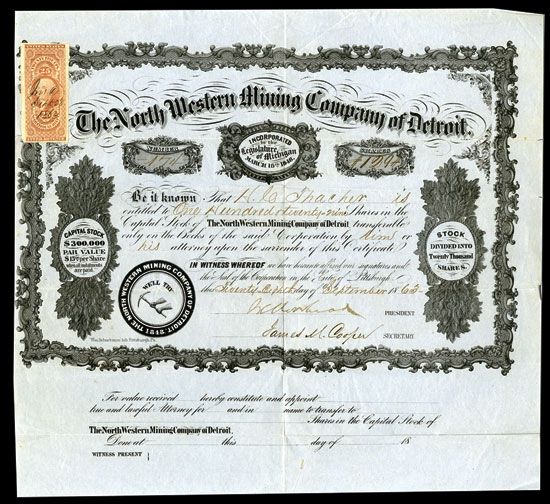 Michigan, 1863, 129 Shares, issued and Uncancelled, black with no underprint, Ornate borders and flowery designs with arms and miners pick in corporate seal on lower left, S/N 174, 25cts Imperforate Warehouse Stamp on upper left, issued to H.C. Thacher, Signed by J. Moorehead as president and James Cooper as Secretary, Incorporated in 1848, the mine was comprised of 1600 acres in sections in Eagle Harbor, This mining company took over a predecessor mine and was a little more successful shipping over 300,000 Lbs of copper between 1852 and 1856. William Schuchman Lith, Pittsburgh, PA. This is the second one known.