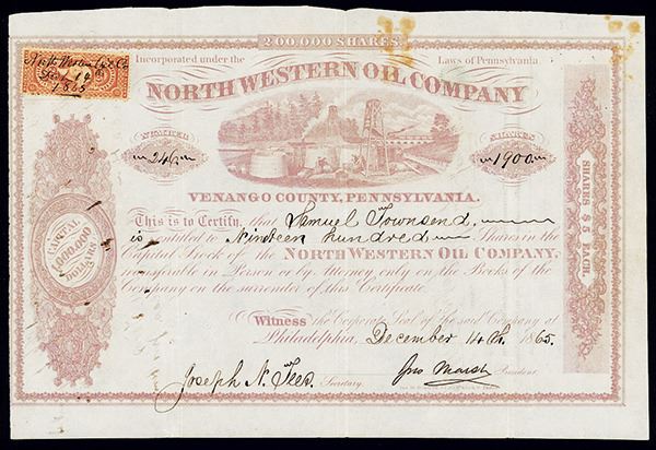 Pennsylvania. 1900 Shares Capitol Stock, I/U Certificate. Pale brown print with pale brown border. Vignette of early oil well and barreling of the oil top center. VF-XF condition, Jas McGrigan Lithography.
