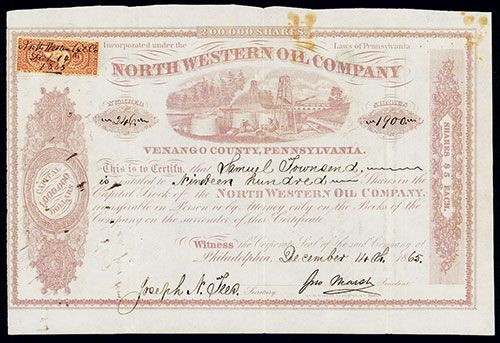 Pennsylvania, 1865, 1900 Shares, Issued Stock, Black on light pink border and underprint, Vignette of early oil well and barreling of the oil top center, VF-XF condition, Jas McGrigan Lithography.