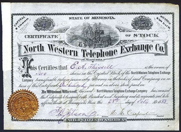 Minnesota. 2 Shares Capital Stock Issued and Uncancelled Certificate, Low serial number: #19, Black print with black ornate border and gold seal bottom left, VF condition.