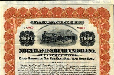 South Carolina; North Carolina. 1914. $1,000. Specimen 1st Mortgage 6%, 50 Year, Gold Bond . Orange border. Locomotive at station. Coupons attached. Red specimen overprints, POC's and "00000" serial numbers. XF condition. FL-ABNC.