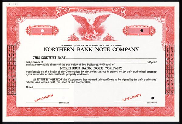 Illinois. Odd Shares Specimen Stock Certificate, Black print on red border, Company title at top with Bald Eagle above, Specimen overprints and POC's, VF-XF condition, NBNC. Northern Bank Note company was one of the largest printers of municipal bonds in the U.S.