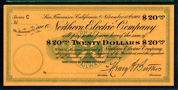 San Francisco, CA. November 15th, 1907. $20. Series C. Specimen or unissued panic scrip note. Blue-green border and black text printed on light orange paper. Facsimile signature of “Henry Butler” as president. PMG graded Gem Uncirculated 66 EPQ. Britton & Rey. Rare Railroad related Panic scrip currency.