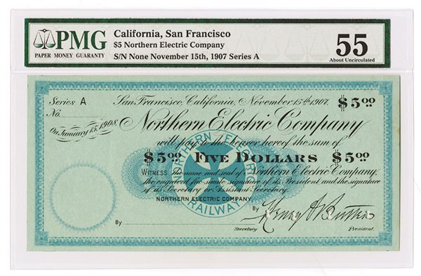 San Francisco, CA. November 15th, 1907. $5. Series A. P-Unlisted. Specimen panic scrip note. Blue-green border and text printed on light blue-green paper. Facsimile signature of "Henry Butler" as president. Note has been graded in a PMG holder, "55 About Uncirculated". Britton & Rey. Rare Railroad related Panic scrip currency.