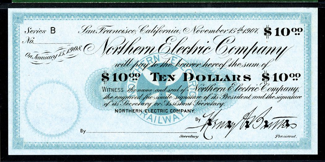 San Francisco, CA. November 15th, 1907. $10. Series B. Specimen or unissued panic scrip note. Blue border and text printed on light blue paper. Facsimile signature of "Henry Butler" as president. Note has been graded in a PMG holder, 65 Gem Uncirculated EPQ. Britton & Rey. Rare Railroad related Panic scrip currency.