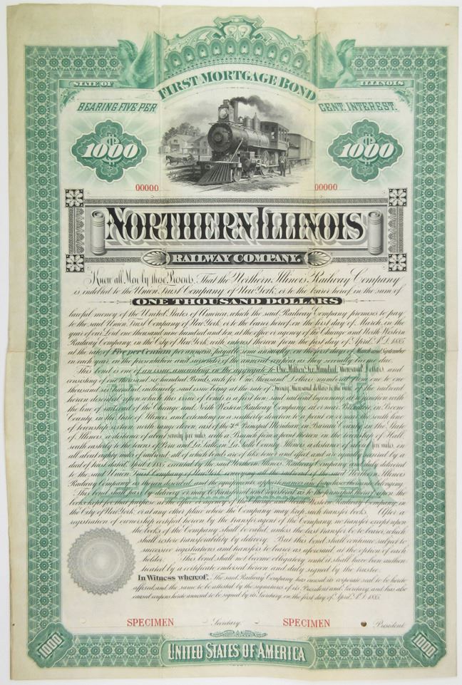 Illinois. 1885, $1000 Specimen 5% First Mortgage Coupon Bond, Black text with ornate green border and underprint, Illustration of a #15 train with man at top. Red specimen overprints, "00000" serial numbers and POC's, VF condition with archivally reinforced splitting along bottom and top fold lines, ABNC. Unlisted railroad in Cox, Extremely attractive and Rare.