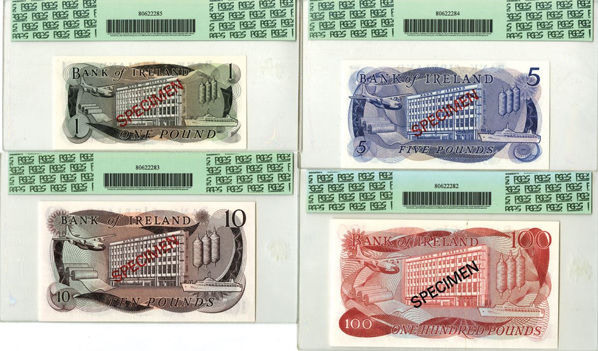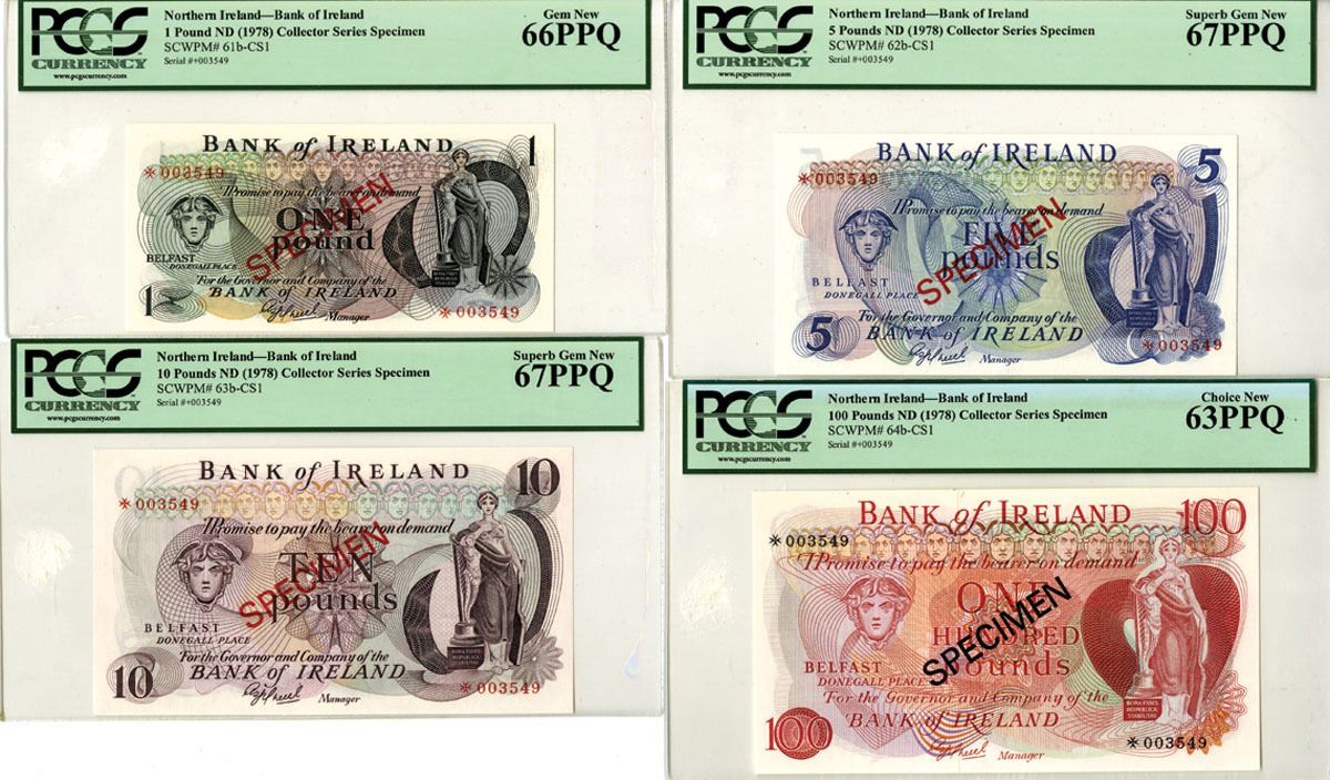 Northern Ireland, ND (1978). Lot of 4 Collector Series Specimen Banknotes, Includes: 1 Pound, P-61bCS1, S/N *002549, PCGS graded Gem New 66PPQ; 5 Pounds, P-62bCS1, S/N *002549, PCGS graded Superb Gem New 67PPQ; 10 Pounds, P-63bCS1, S/N *002549, PCGS graded Superb Gem New 67PPQ; 100 Pounds, P-41bCS1, S/N *002549, PCGS graded Choice New 63PPQ. All have Specimen overprints. (4). Sold "AS IS" no returns accepted.