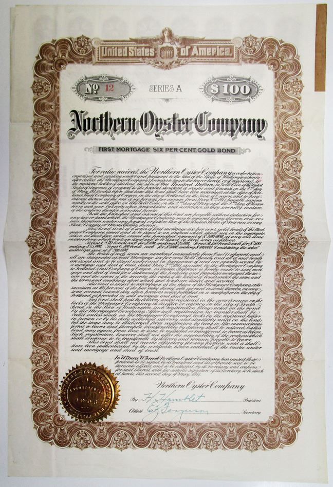 Washington, 1911. $100 I/U 6% First Mortgage Gold Coupon Bond, S/N 12, Black text with brown border, Gold-embossed seal at bottom left corner. Fine-VF condition. Northern Oyster provides oysters, clams and various other types of seafood for wholesale distribution.