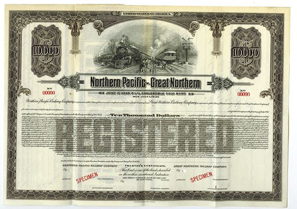 Minnesota. $10,000 Specimen 6 1/2% Registered Joint Convertible Gold Bond, Black print on black/brown border and under tint, Locomotives passing men repairing tracks at top, Specimen overprints and POC's, VF-XF condition, ABNC.