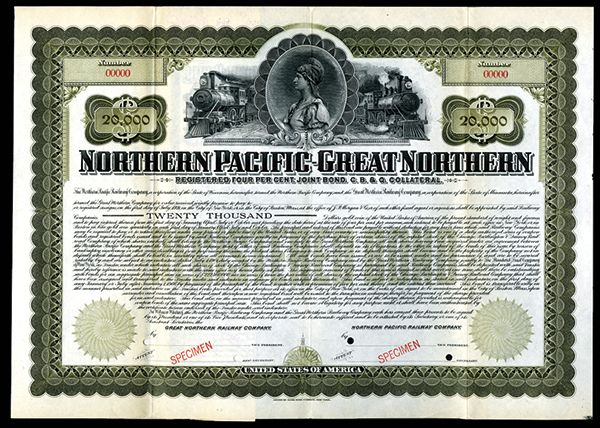 Northern Pacific-Great Northern Railway Co., 1901 Specimen Bond. Minnesota, $20,000 Specimen Registered 4% Joint Bond, C.B.Q. Collateral. Olive-green border in horizontal format. Liberty facing left flanked by locomotives. XF condition. Red specimen overprints, POC's and "00000" serial numbers. No coupons attached. Rare certificate. Unlisted denomination in Cox and first time reported. ABNC.