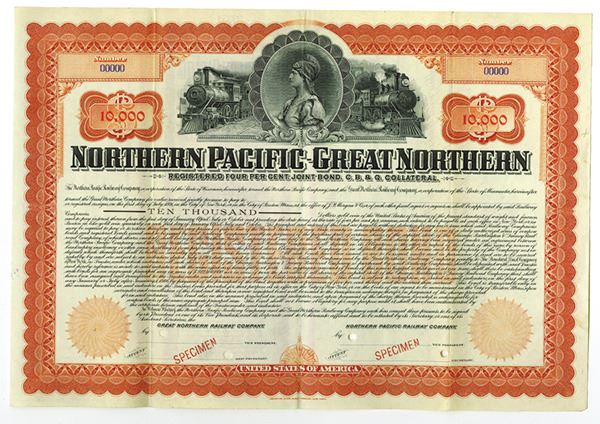 Minnesota. $10,000 Specimen 4% Registered Joint Collateral Bond, Black print on orange green border and under tint on horizontal format, Allegorical woman at top with locomotives coming out from behind him, Specimen overprints and POC's, VF-XF condition, ABNC.