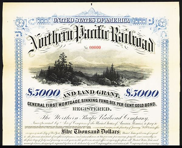 $5000 Specimen 6% General First Mortgage Sinking Fund Gold Bond. Black and blue print with a blue border. Vignette of a wagon trail with a city in the background on right and large mountains on left. Specimen overprints, POC's, VF condition with horizontal creases from folding. ABNC.
