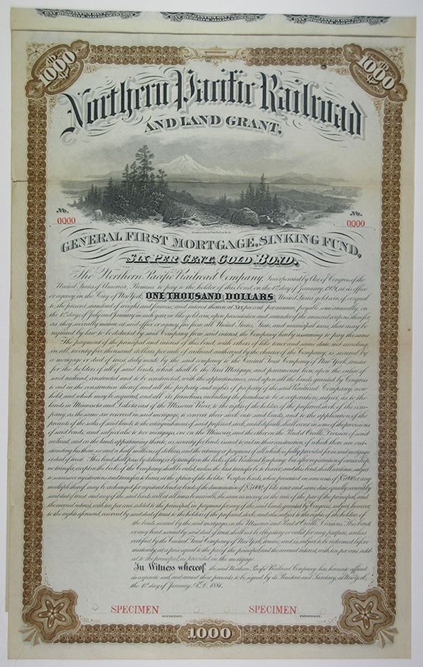1881, $1,000. 6% general first mortgage sinking fund gold bond. Brown border with impressive mountain, trees, lake and city panorama. ABNCo. Specimen with coupons, XF.