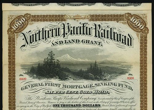 1881, $1,000. 6% general first mortgage sinking fund gold bond. Brown border with impressive mountain, trees, lake and city panorama. ABNCo. Specimen with coupons, XF.