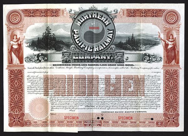 Minnesota, Wisconsin, 1896, $1000, Specimen Registered Prior Lien Railway and Land Grant 4% Gold Bond, Horizontal format, panoramic view of mountains and forests flank Northern Pacific logo, POC's, VF-XF condition, ABNC. Unlisted as a $-Odd Bond in Cox. Rare and very attractive.