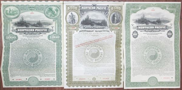 Wisconsin. Lot of 3 specimen bonds, Includes 1896, $500 Specimen 4% Prior Lien Railway and Land Grant Gold Coupon Bond in brown; 1914, $1000 Specimen 4.5% Refunding and Improvement Mortgage Coupon Bond in green with forest and mountain view, unlisted design variety in Cox; and 1914, $1000 Specimen 4.5% Refunding and Improvement Mortgage Coupon Bond in green, also with forest and mountain view with pioneer on horseback top left and surveyors with locomotive top right, only known as a specimen in Cox. All 3 are in VF to XF condition and have red specimen overprints, 00000 serial numbers and POCs. ABNC.