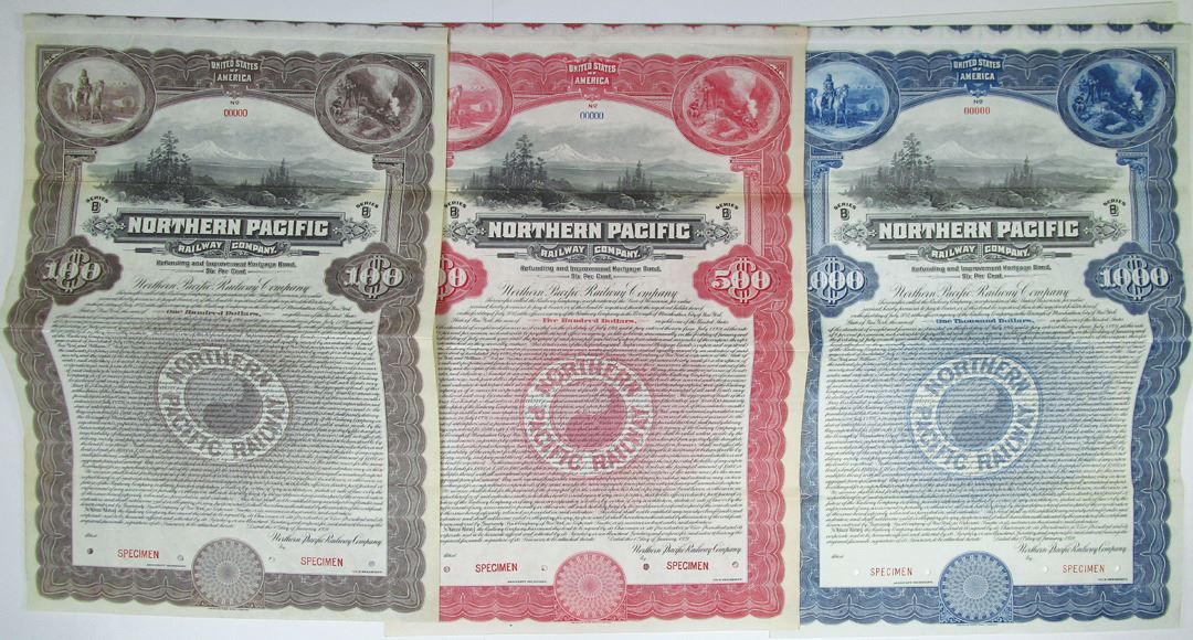 Wisconsin, 1921. 3 pieces, all are Specimen 6% Refunding and Improvement Mortgage Coupon Bonds: $1000 in blue; $500 in red; $100 in brown. All have specimen overprints, 00000 serial numbers, and POCs. Fine-VF condition, ABNC. All are rare as specimens in Cox. (3)