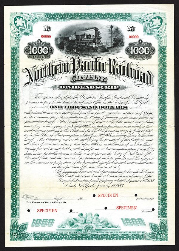 Minnesota, Specimen bond. 1883. $1000 6% Dividend Scrip. Green border and undertint. Locomotive L-R passing telegraph poles. Red specimen overprints, POC's and "0000" serial numbers. Rare and attractive Minnesota railroad bond. Unlisted bond variety in Cox. 3 were found in the archive 12 years ago. ABNC.