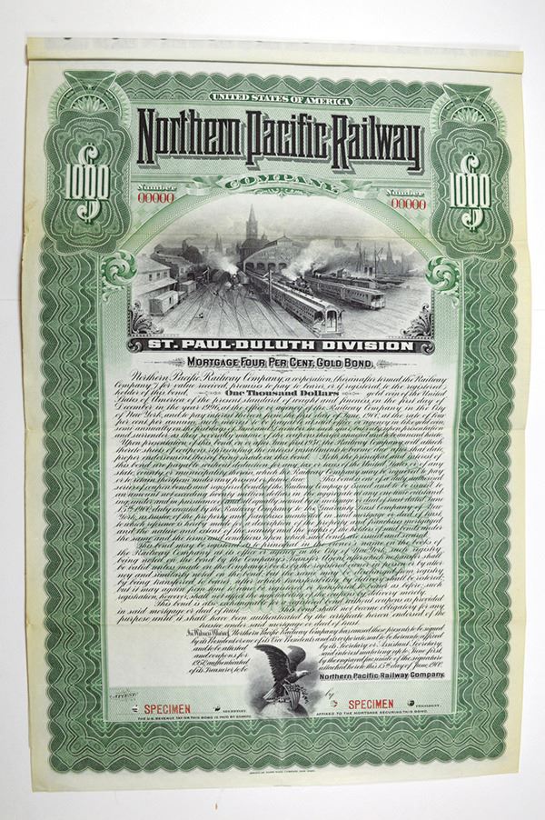 Minnesota. 1900. $1000 Mortgage Four Percent Gold Bond, green frame, Rail yard vignette, ABNC
