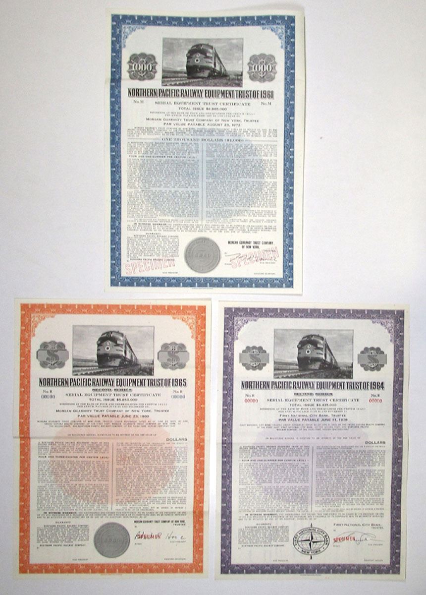 MN. Lot of 3 Specimen Serial Equipment Trust Certificates, including: 1961 $1000 4.25% Coupon Bond with blue border; and a Pair of $Odd Registered Bonds, Second Series including 4.25% Bond with purple border; and 4 3/8% Bond with orange border, All with same vignette of Northern Pacific train approaching at top center. Red specimen overprints and POCs. Condition ranges from XF to Unc. ABNC. (3). Sold "AS IS" No returns accepted. Blue Bond is Unlisted in Cox.