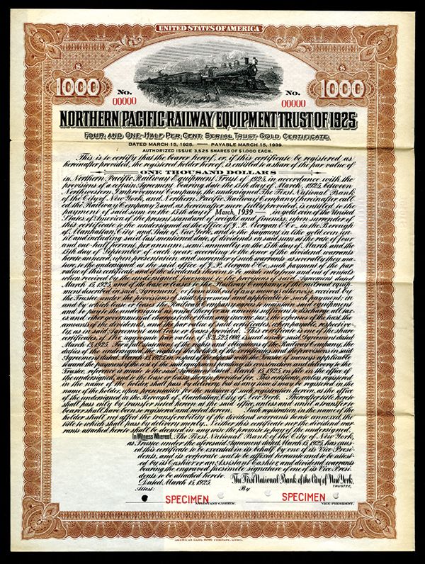 Northern Pacific Railway Equipment Trust of 1925 Specimen Coupon Bond. Minnesota. Wisconsin. 1925, $1000, Specimen 4 1/2% Serial Trust Gold Coupon Bond, Vertical format, Black with light brown border and underprint, POC's, VF-XF condition, ABNC. Unlisted Bond name, variety and date in Cox.