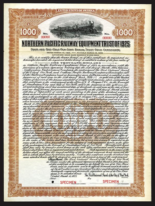 Minnesota. Wisconsin. 1925, $1000, Specimen 4 1/2% Serial Trust Gold Coupon Bond, Vertical format, Black with light brown border and underprint, POC's, VF-XF condition, ABNC. Unlisted Bond name, variety and date in Cox.