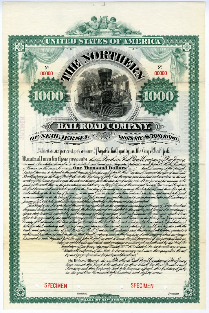 New Jersey. $1,000 Specimen 6% Coupon Bond, Black print on green border and under print, Close up of locomotive at station at top in circle with title on top, cherubs on upper corners and very top, Specimen overprints and POC's, VF-XF condition, ABNC. Rare bond only known as a specimen in Cox with no issued examples known.