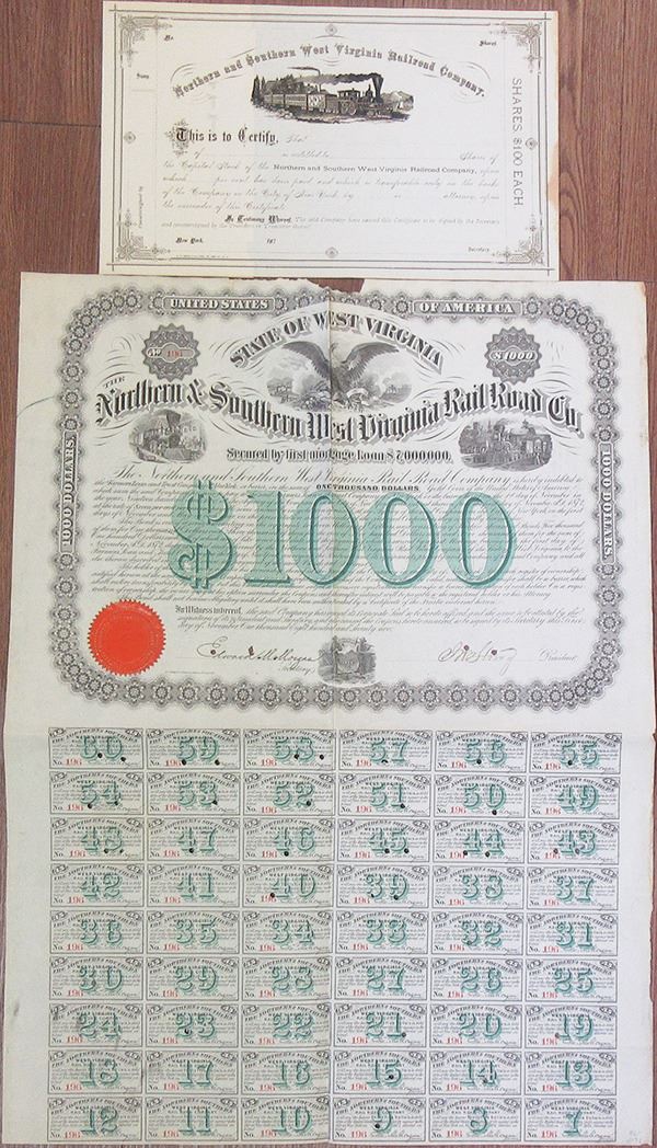 West Virginia, 1870s. Lot includes 2 pieces, Includes 1870s U/U Capital Stock Certificate, Black text with thin black border, no underprint, Scene at top center of train passing, Fine-VF condition with water mark along right margin; 1872 1/C $1000 7% First Mortgage Coupon Bond, Black text with black border and green underprint, Scene of an eagle at top center, flanked by railroad scenes, Fine condition with damage to margins. 2 pieces.