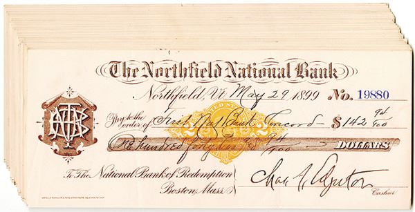 Vermont, 1899. Lot of 30 Issued checks from the Northfield National Bank, Brown text printed on pink paper, Company logo depicted at left. All with RN-X7 imprinted revenues, All are in XF to AU condition. (30)