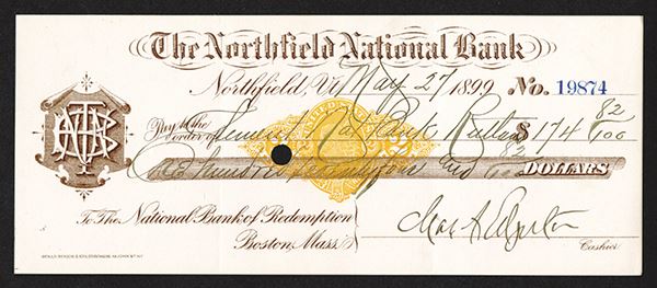 VT. Check 1899. POC. Printed revenue stamp. Very Fine.