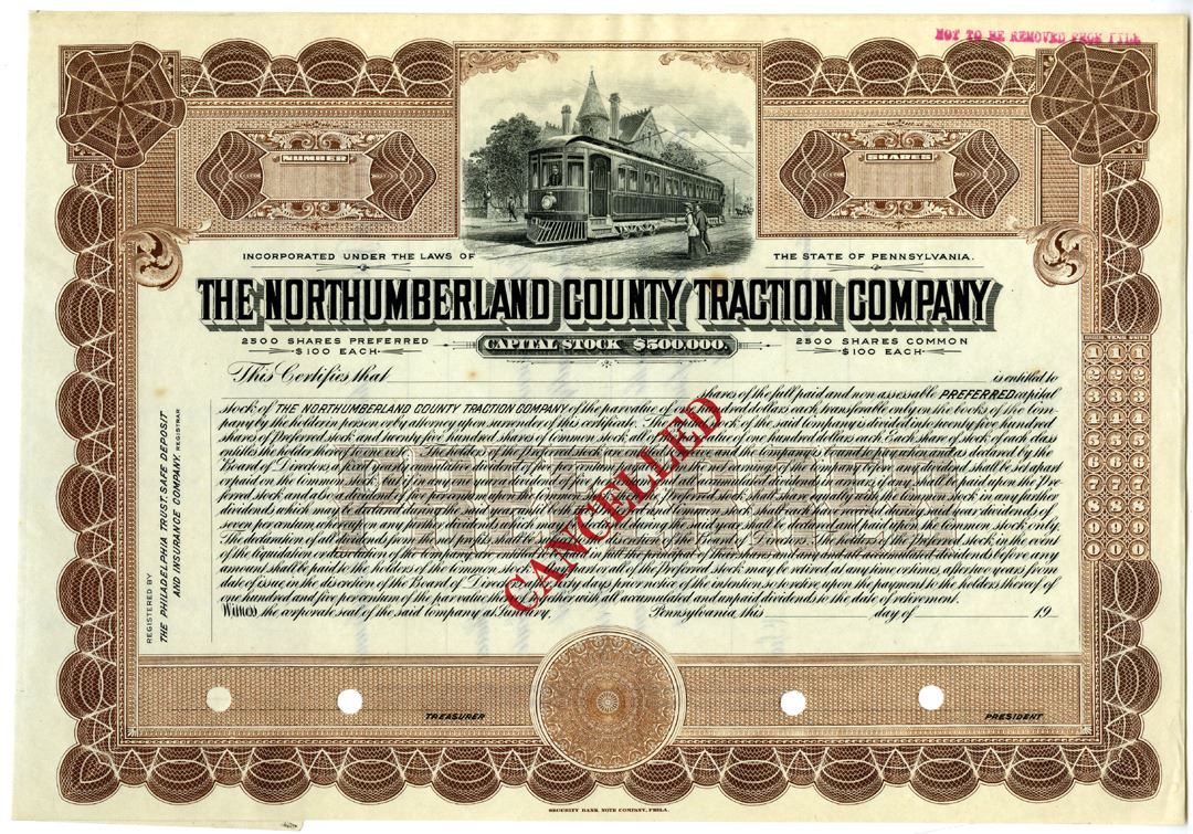 Pennsylvania. Preferred Stock Specimen Certificate, Black print on brown border and under tint, Interurban electric street at top, Red "Cancelled" overprint. POC's. XF condition. Unlisted railroad in Cox. Rare and attractive. SBNC.