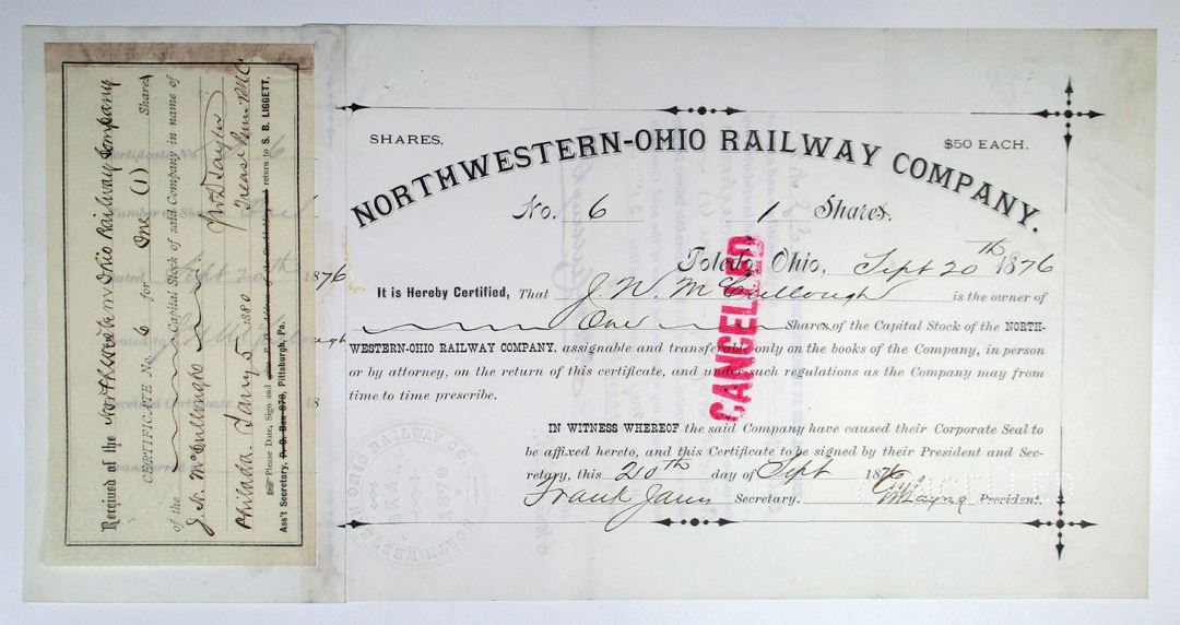 Ohio, 1876. 1 Share I/C Capital Stock Certificate, S/N #6, Curved title with Black text with black border. POC and cancelled stamp at center with receipt of redemption. VF condition. Rare stock certificate in Cox.