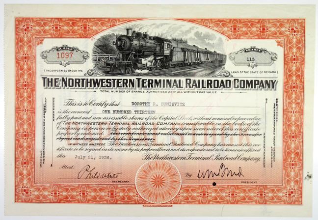Nevada, 1936, 113 Shares, I/U stock, Cert#1097, Black on orange border and underprint, Vignette of moving locomotive carrying some type of ore in the countryside top center, VF-XF condition, RBNC. Rare and attractive railroad stock certificate. Railroad and stock listed in Cox.