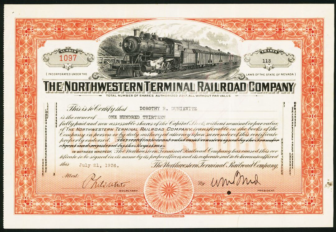 Nevada, 1936, 113 Shares, I/U stock, Cert#1097, Black on orange border and underprint, Vignette of moving locomotive carrying some type of ore in the countryside top center, VF-XF condition, RBNC. Rare and attractive railroad stock certificate. Railroad and stock listed in Cox.