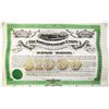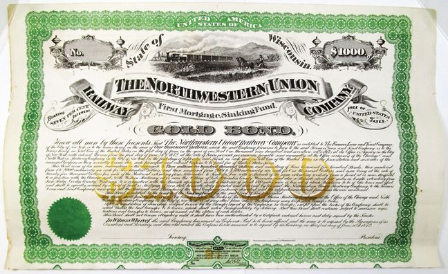 Wisconsin, 1872. $1000 Unmarked Specimen 7% First Mortgage Sinking Fund Gold Coupon Bond, Ornate and attractive Black text with green border and metallic gold underprint, Train passing by man plowing with horses in field at top center. 90 coupons attached to bottom. The bottom 2 rows have POC's but evidently they gave up punching the balance of the bond. VF condition, Henry Seibert & Bros. Unlisted railroad in Cox, Very Rare unmarked specimen from a new find with only 3 examples of this denomination found for this railroad.