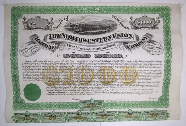 Wisconsin, 1872. $1000 Unmarked Specimen, 7% First Mortgage Sinking Fund Gold Coupon Bond, Black on green border and gold underprint, Oversized certificate, Locomotive passing man on horse drawn plow at top, XF condition, Coupons attached, Henry Seibert & Bros. Unknown issued, only as a specimen in Cox. No photo available in Cox. Rare and attractive bond.