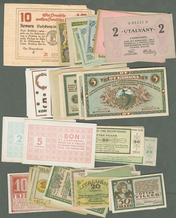 Austria, Hungary, Slovakia, Ukraine. 1916-1921. Includes: Berjegy, Budapest, Nagymegyer, Nagyszollos, Salzburg, Sopronnyek, Szekesfemervar, and a bunch of Bon and Utalvany notes. Mostly Extremely Fine to Uncirculated, one with a tear or two, a few others VF. 75 pieces.