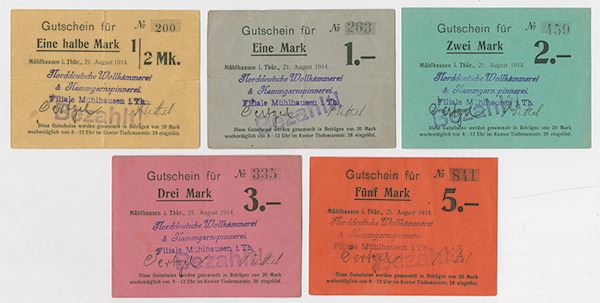 Germany. Lot of 5 notes. Includes a set of 1/2, 1, 2, 3, and 5 Mark issued by Norddeutsche Wollkammerei & Kammgarnspinnerei (North German Wool & Combing). The 1/2 Mark with horizontal split, otherwise all VF-XF.