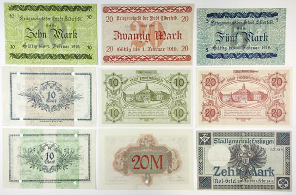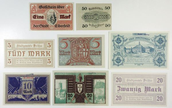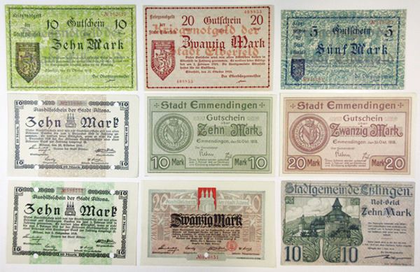 Germany. Includes various 1, 5, 10, and 20 Mark issues from: Altona, Dirschau, Eisenach, Elberfeld, Emendingen, and Esslingen. Generally VF-XF. 13 pieces.