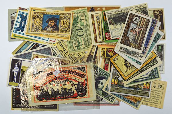 Germany. Group of 1917-1922 Notgeld issues. Singles or sets from: Erfurt, Eutin, Finsterwalde, Frankfurt, Liebau, Saalfeld, Salzig, Salzungen, Segeberg, Schmolln, and many others. Mostly Uncirculated, one or two with stains or staple tears, three others with tape residue. Just over 100 pieces.