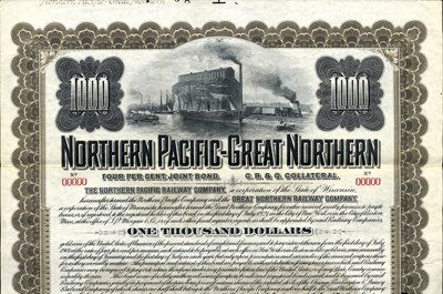 Wisconsin; Minnesota. 1901. $1,000. Specimen 4% Joint Bond, C.B.Q. Collateral. Brown border in vertical format. Steamship, train and warehouse on top and locomotive leaving station on bottom. XF condition. Red specimen overprints, POC's and "00000" serial numbers. No coupons attached. Rare certificate. ABNC.