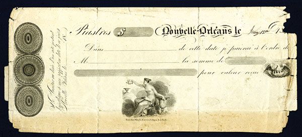 New Orleans Louisiana, 18xx (ca. 1830's, Proof Draft payable in Piastres, Black lathework on left counterfoil, Young topless woman seated at bottom middle pouring liquid, Choice VF to Fine with 2 strong vertical folds and edge faults with small pieces missing from top and bottom right side of note and small edge tears on the left side, still presentable and very rare. RWH&E.