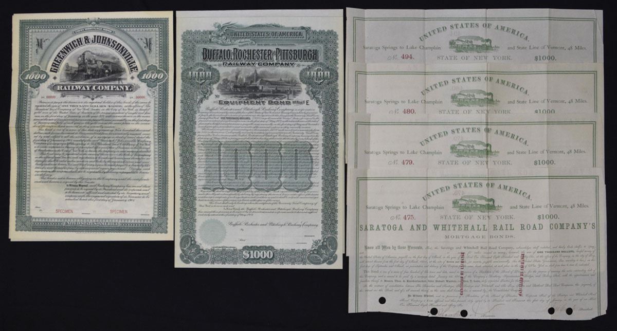 New York & Pennsylvania, Lot of 6 I/C and Specimen Bonds, Includes a lot of 4, 1862, Saratoga and Whitehall Rail Road Co., $1000, I/C, 7% Bonds with Cancelled overprints and POCs; 1904, Buffalo, Rochester and Pittsburgh Railway Co., $1000 Specimen 4 1/2% Series E, Equipment Gold Coupon Bond; and, 1904, Greenwich & Johnsonville Railway Co., $1000 Specimen 4% Coupon Bond, this company had 12 miles of track between Johnsonville and Greenwich . Specimens have overprints and POCs, The specimens are in VF to XF condition and the Saratoga bonds are in Fine condition with small faults. (6). Sold "AS IS" no returns accepted.