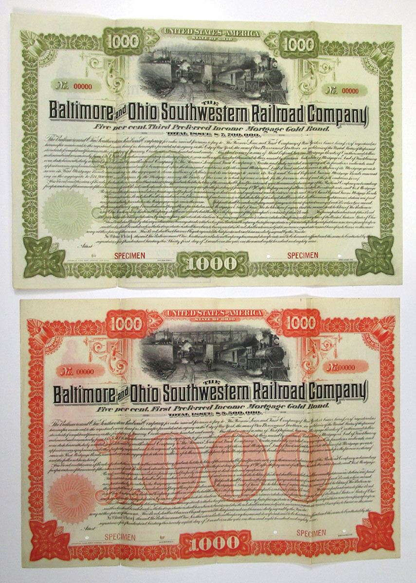 Ohio, 1889, Baltimore and Ohio Southwestern Railroad Co. $1000, 5% Registered First Preferred and Third Preferred Income Mortgage Gold Bonds, First has red border while third has olive green, Both have railyard vignette at top above company title, Specimen overprints, POCs, and are in VF to XF condition. ABNC. Attractive railroad bond pair. Only 3 examples of each were found in 2002 in the ABNC auctions. These are the only examples available.