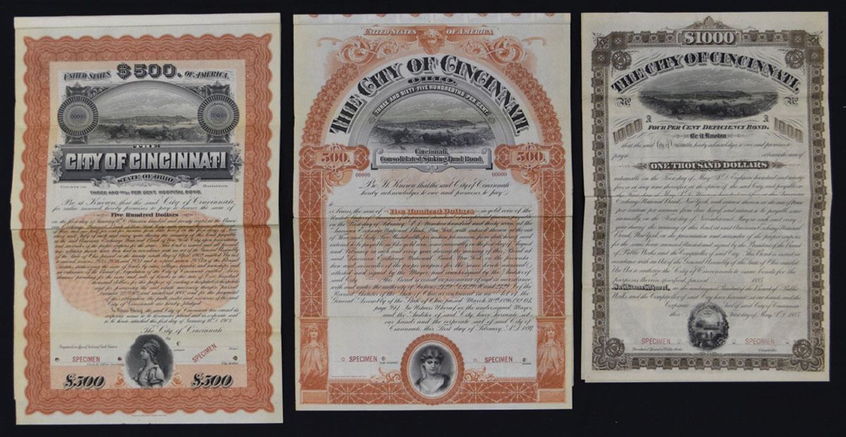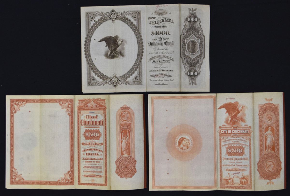 Cincinnati, Ohio, 1885-1903. Lot of 3 Specimen Bonds, Includes: 1885, $1000 4% Deficiency Coupon Bond; 1897, $500 3 65/100% Consolidated Sinking Fund Coupon Bond; 1903, $500 3.5% Hospital Coupon Bond. All with specimen overprints and POCs, VF condition, printed by ABNC. (3). A very attractive trio of Cincinnati bonds.