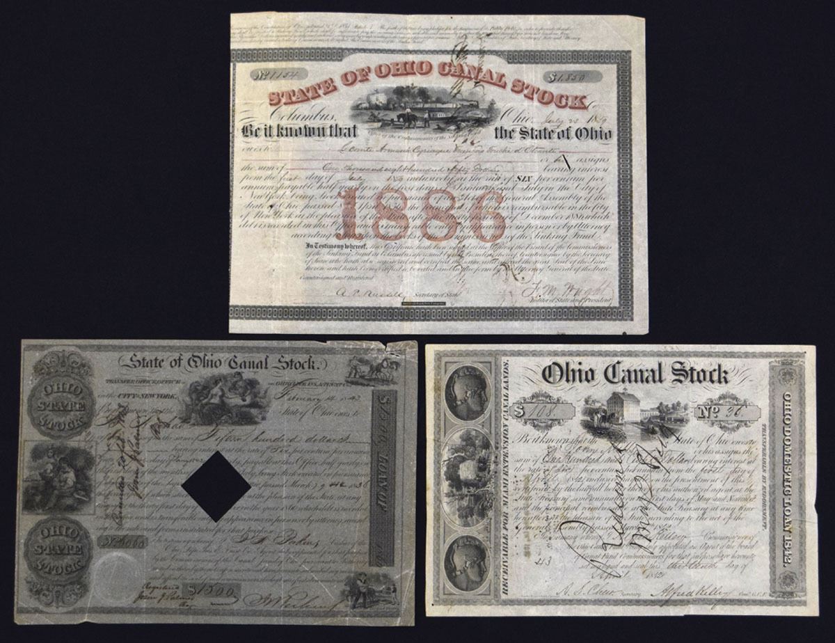 Ohio, 1842-59. Lot of 3 I/C Bonds, Includes: 1842, $108 6% Bond, S/N 36; 1843, $1500 6% Bond, S/N 6060; 1859, $1850 6% Bond, S/N 1154. Bonds are all cut cancelled or crossed out cancelled and range from Fine to VF condition. (3). Sold "AS IS" no returns accepted.