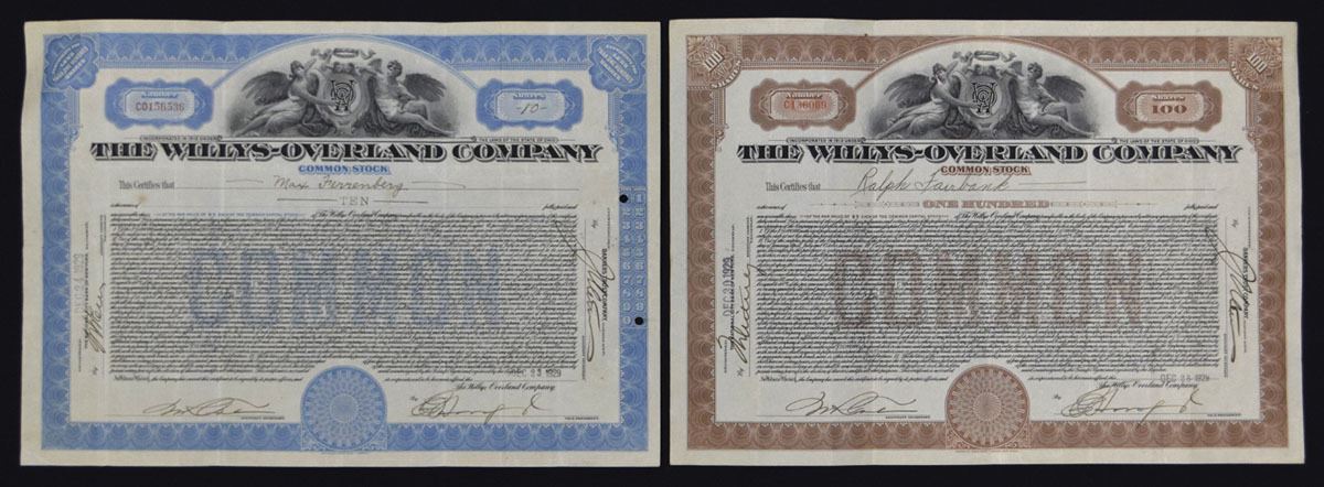 Ohio, 1929. Lot of 2, I/U Stock Certificates for 10 Shares Common Stock and 100 Shares Common Stock, Both display ornate borders, allegorical vignettes, and classic automotive-era styling. Conditions range from VF to AU. (2). Sold “AS IS” no returns accepted.