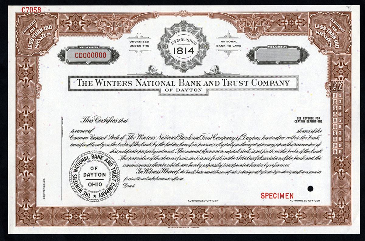 Ohio. <100 Shares Common Capital Stock Specimen Certificate, Black print on brown border and under tint, Company title at top, Specimen overprints and POC's, VF-XF condition, ABNC.